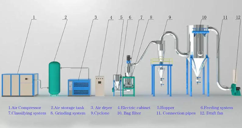 El molino de chorro LHL utiliza aire comprimido que está congelado, filtrado y secado para formar un flujo de aire supersónico inyectado en la cámara de aplastamiento, fluidando el material. Las partículas aceleradas chocan en la intersección de múltiples flujos de aire de boquilla, logrando aplastamiento ultra fino a través de fuerzas severas de colisión, fricción y corte.